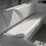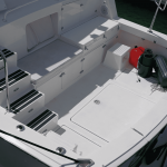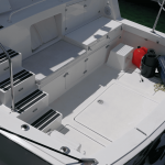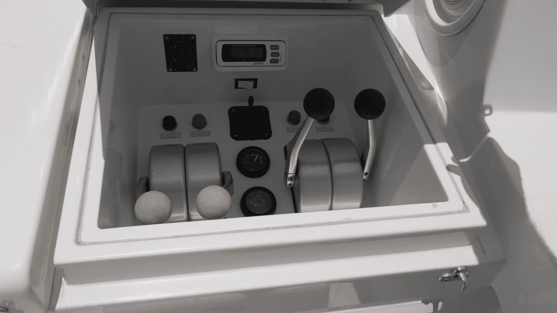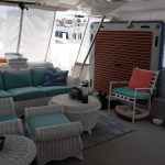 The helm station has sleek, all-white modern design with 2 captain’s chairs, wraparound couch seating, zippable windows, all boat controls along with a new Garmin chartplotter and radar.