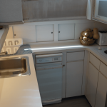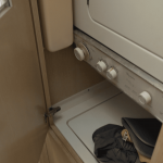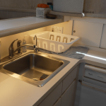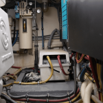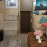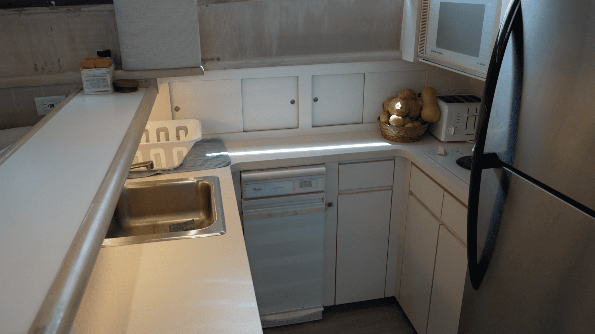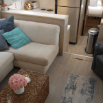The bright main salon area holds a large, comfortable couch perfect for entertaining, with a flatscreen TV, custom LED lighting and newly replaced floors, native wifi network and cellphone signal booster. Feels like an apartment space! Quick A/C keeps the entire space cool. Leads right to the galley with decent counter space, new fridge, full sink with filtered drinking water and disposable, plenty of storage and pantry space. There’s a dining area or work zone right to the side, and a functional washer/dryer closet as well.